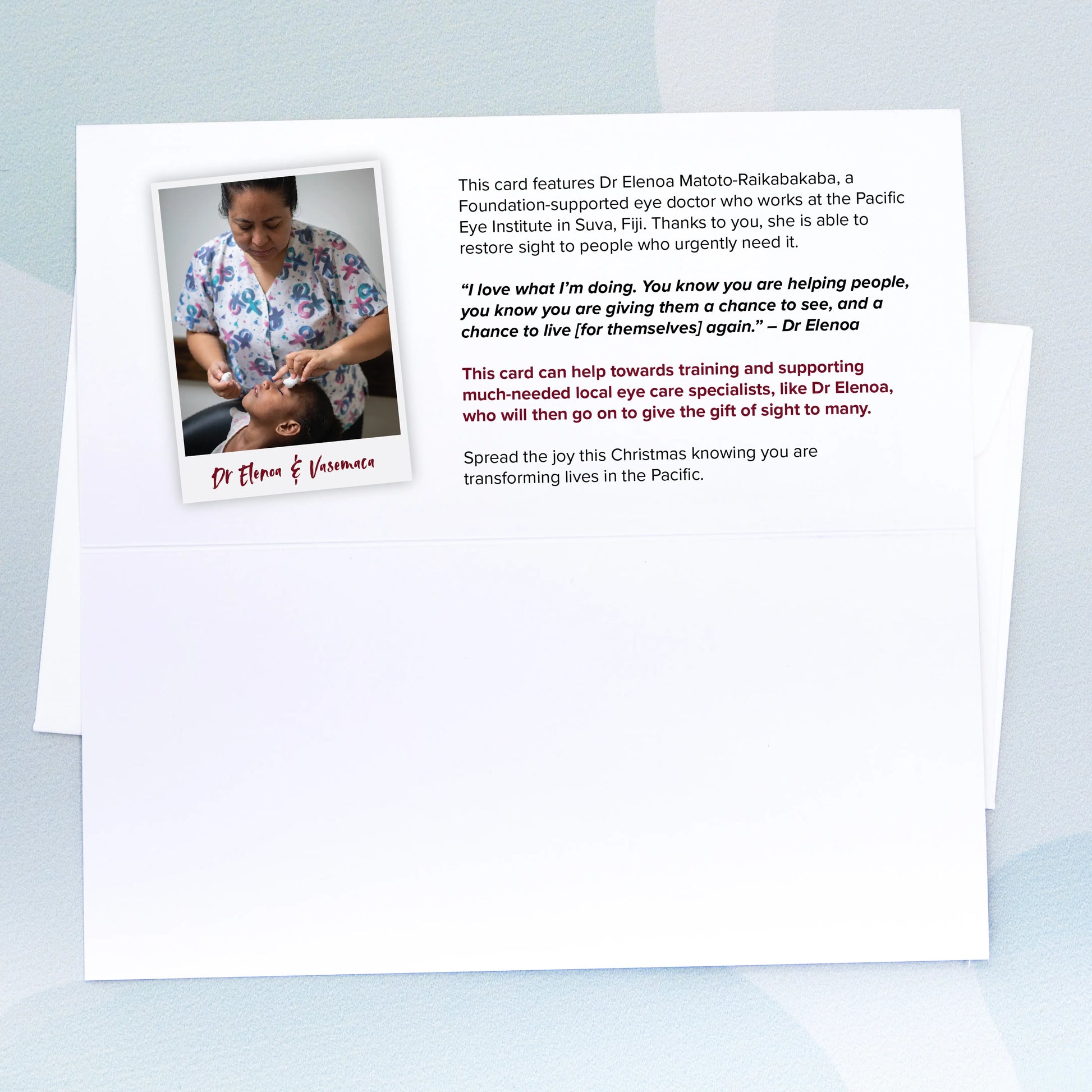 This card can help towards training and supporting much-needed local eye care specialists, like Dr Elenoa, who will then go on to give the gift of sight to many.